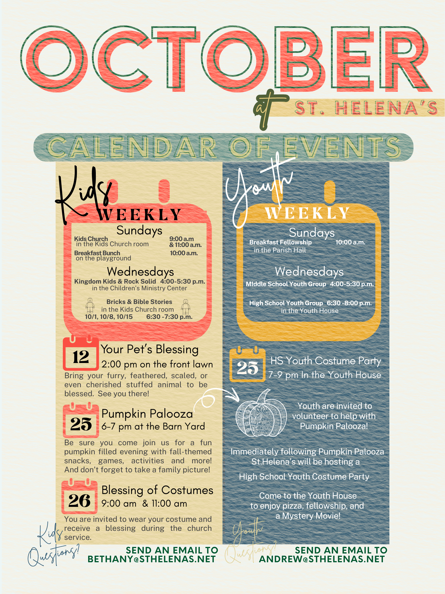 To learn more about our weekly gatherings, opportunities to serve, mission trips, and youth retreats, contact Andrew Snyder at youth@sthelenas.net.